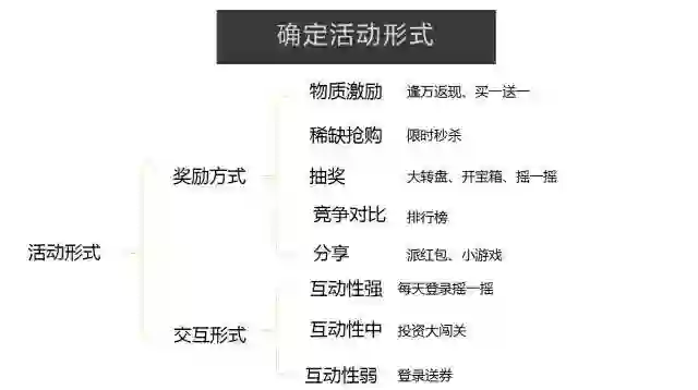活动形式我从奖励方式还有交互形式两个方向做了总结。奖励方式会有物质激励、稀缺抢购、抽奖、竞争对比、分享等等。交互形式也会有强中弱的区别。那每一种形式其实都有它对应的效果。