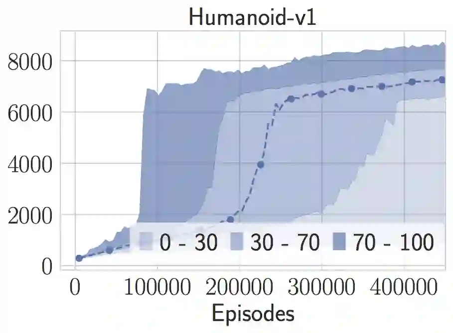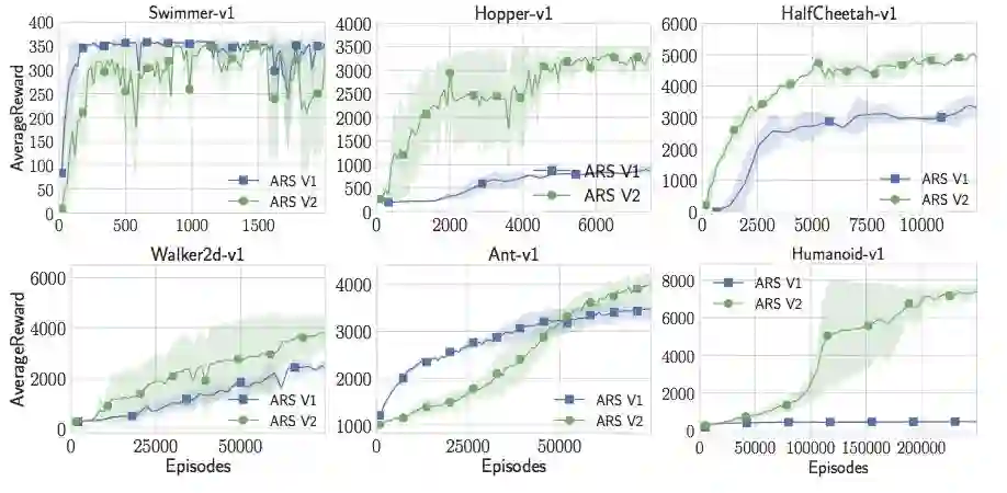 在简单算法中添加超参数和算法小部件,可以在足够小的一组基准测试中提高其性能。我不确定是否放弃最好的方向或状态归一化会对新的随机搜索问题起作用,但这对MuJoCo的标准和有用。通过添加更多可调参数,甚至可以获得更多回报。