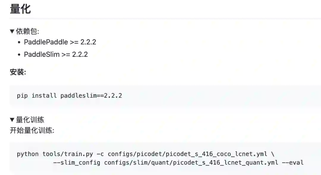 更好优化支持:考虑到端侧对计算量的优化追求是极致的,PP-PicoDet在模型量化训练和稀疏化压缩方案支持方面做了更深度的打磨,仅需两步,即可实现在移动端部署加速30%以上的效果。