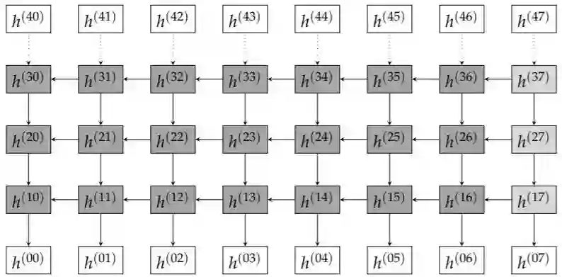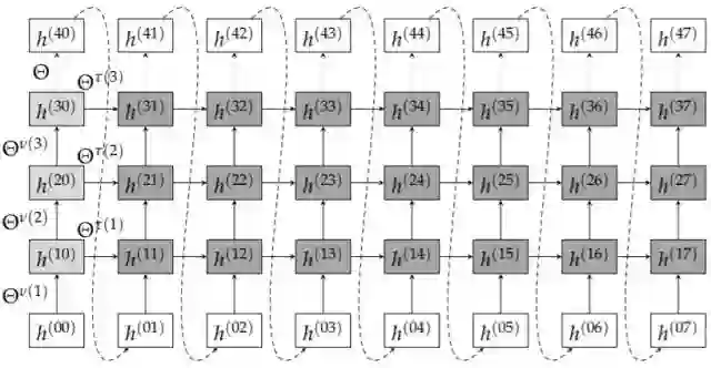 图 6.1 RNN 架构,数据在「空间」和「时间」域同时传播。在我们的例子中,时间尺寸为 8,而空间尺寸为 4。