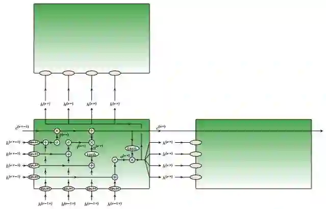 在长短期记忆网络 [7], 中,给定单元的状态并不由其左侧或底部近邻直接决定,而是由相应的隐藏单元决定,而该单元输出是单元状态的探测。首先,这个表达式看来令人困惑,但与第四章附录中我们接触到的 ResNet 方法类似:与尝试让输入内容与复杂的函数适应相反,我们试图让这些输入的变量产生微小的变化,从而允许梯度在网络中以更平滑的方式流动。在 LSTM 网络中,我们需要引入几个门:输入门判定是否让新的信息进入单元;输出门判定是否将输出值设置为 0,或反映目前的单元状态;最后,遗忘门决定是否遗忘过去的单元状态。所有这些都在图 6.5 中展示,其中 LSTM 与 6.4.1 中 RNN 结构相对应。