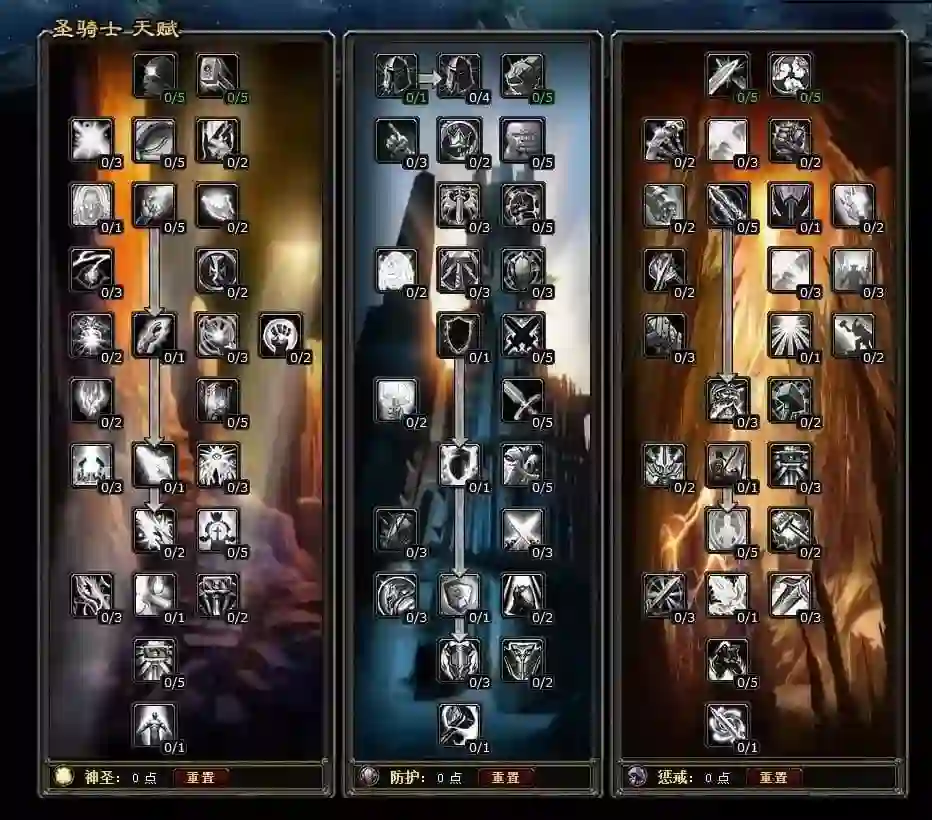 拿圣骑士举例,分为 “神圣、防护、惩戒” 三个专精方向,玩家可根据职业需要的方向,把每升一级获得的技能点,增加到天赋树的技能上,角色就会变得越来越强大。