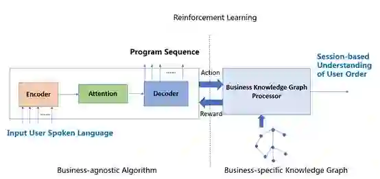 在架构上,该方案将算法和业务分离,使用业务知识图谱有效地表达业务相关的知识,利用序列到序列的深度学习模型自动学习出用户口语输入到意图结构化表达的映射关系,利用业务知识图谱表达业务逻辑,对于这个自动的映射学习模型进行强化学习以达到弱监督的目的。 这样一方面整个系统只需要少量端到端的数据标注进行训练,大大减少了标注压力; 另一方面由于知识图谱的松耦合度,使得扩展到新的业务变得更为便捷。