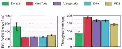 比较由OtterTune生成的最佳配置与其他工具的“优化脚本”、RDS生成的配置,OtterTune推荐的配置对MySQL数据库大约降低了60%的延迟,提升了22%到35%的吞吐量。OtterTune生成的配置几乎与DBA做的选择一样好。