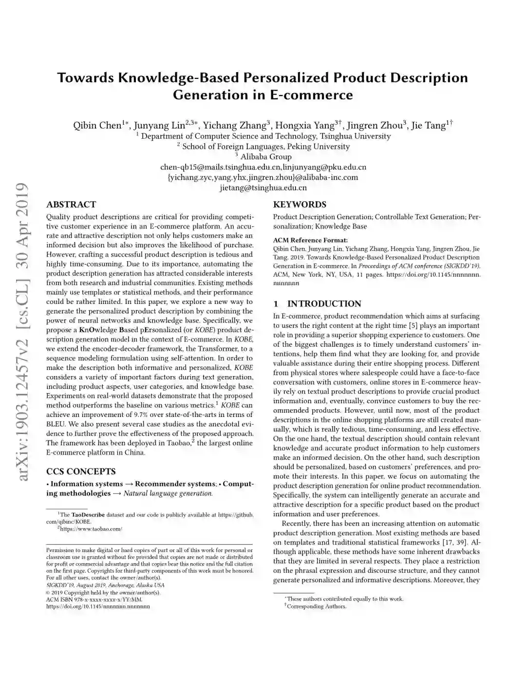 论文链接: https://arxiv.org/pdf/1903.12457.pdf 论文题目: Towards Knowledge-Based Personalized Product Description Generation in E-commerce
