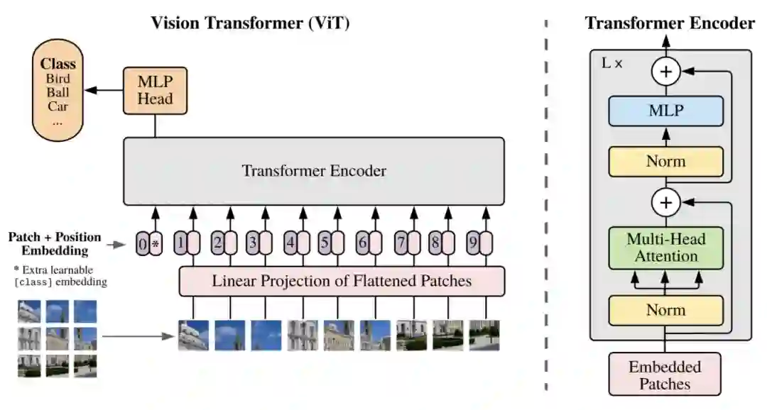 模型的主体结构采用的是ViT,VIT的具体结构我们在之前的文章介绍过,这里再复述一遍。ViT将图像划分成多个patch,假设原来图像的维度是[W, H, C](宽度*高度*channel),那么经过转换后的图像维度为[N, P*P*C],其中P代表将图像的分成了多少个块,P对应的就是图像转换成的序列的长度。接下来每个patch会使用一个NN网络映射成一个固定维度,输入到后续的Transformer Encoder中。