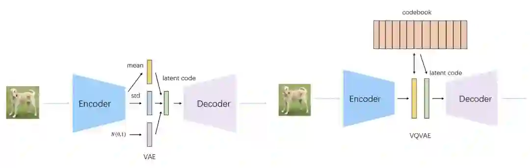 想实现在图像上应用MLM,一个前提条件是将图像转换成离散化的图像token。BEIT采用了Zero-Shot Text-to-Image Generation(2021)这篇文章中介绍的思路,利用dVAE将图像转换成token。这里简单介绍一下dVAE的原理。普通的VAE主要用于生成任务,采用类似于AutoEncoder的框架,利用Encoder将输入数据映射到0均值1方差的高斯分布,再从高斯分布中进行采样一个向量,将采用后的结果向量通过Decoder还原输入样本。这个过程中,Decoder就在学习一个从0均值1方差的高斯分布,到目标数据集分布的一个映射,因此非常适用于生成任务。而dVAE、VQVAE等方法,希望将输入数据映射成离散化的变量,因此将Encoder-Decoder之间的高斯分布替换成了从一个字典中的均匀分布。VAE和dVAE的区别可以参考下面图中的对比。