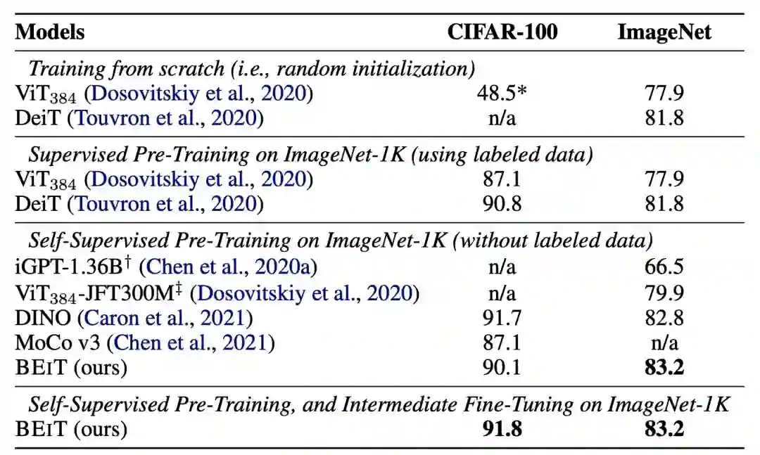 BEIT通过dVAE解决了图像离散化的问题,同时基于ViT成熟的Vision Transformer结构,最终实现了MLM在CV领域无监督学习的应用。从下面的实验结果也可以看出,采用BEIT进行预训练会显著提升图像分类效果,并且无监督预训练的效果要好于之前的iGPT、VIT等CV Transformer模型,同时也优于对比学习方法MoCo。