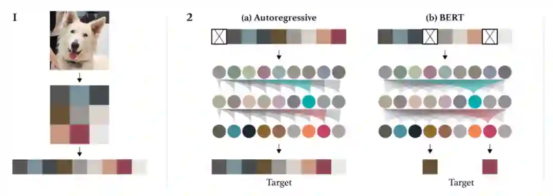 之前的工作中有MLM的尝试。在Generative Pretraining from Pixels(2020)这篇文章中提出了IGPT(如下图),也采用了MLM或者自回归来实现图像预训练。但是IGPT时期由于还没有ViT的建模方法,通过将图像分辨率降低来实现Transformer在CV的应用,丢失了很多图像信息。在ViT中也曾经尝试了MLM自监督学习的方法,但是采用的是回归建模,而并没有对图像patch进行离散化,这种基于像素级别的回归方法存在过度学习小范围细节信息而在整体结构上学习能力不足的问题。
