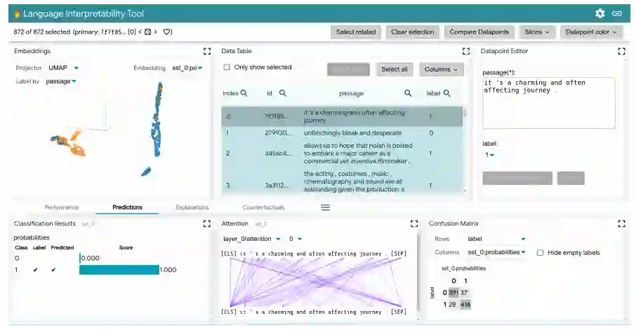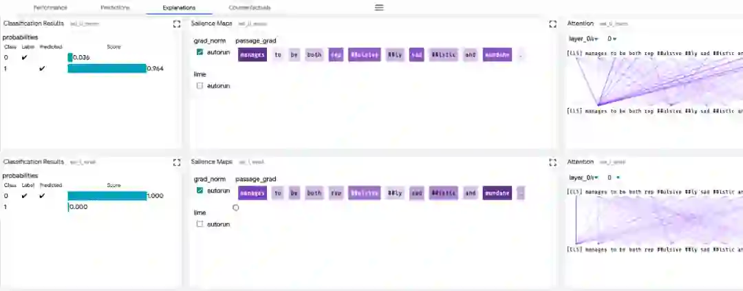 LIT 重点关注模型行为的核心问题,包括:为什么模型做出这样的预测?什么时候性能不佳?在输入变化可控的情况下会发生什么?LIT 将局部解释、聚合分析和反事实生成集成到一个流线型的、基于浏览器的界面中,以实现快速探索和错误分析。