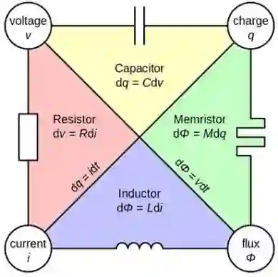 存算融合的一个典型范例就是基于忆阻器的类脑计算。忆阻器的概念由美国加州大学伯克利分校的Leon O Chua教授于1971年首次提出,他在研究电荷、电流、电压和磁通量四者之间的关系时,推断在电阻、电容和电感器之外,应该还存在一个代表电荷和磁通量之间关系的器件,其电阻值会随着通过该器件的电荷量而改变;当掉电时,器件电阻值保持不变,从而实现电荷记忆功能。2008年,惠普实验室研究人员在Nature期刊上发表了文章“Found:the missing circuit element”,证实了忆阻器是确实存在的。