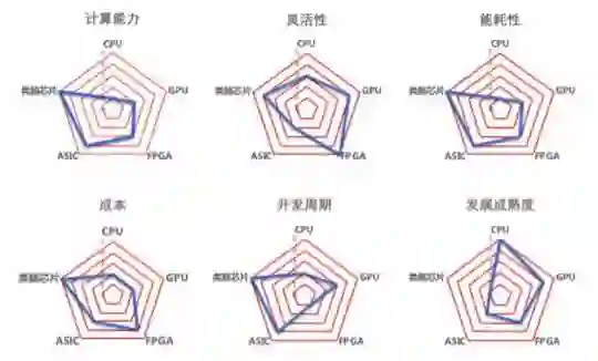 从计算能力、灵活性、能耗性、成本、开发周期、发展成熟度等方面对CPU和四类人工智能芯片进行综合对比,结果如图所示。可以看出,在计算能力方面,类脑芯片最强,ASIC次之;在灵活性方面,FPGA最高,类脑芯片次之;在能耗性方面,类脑芯片最低,ASIC次之;在成本和开发周期方面,类脑芯片和ASIC成本高周期长;在发展成熟度方面,CPU成熟度最高,GPU、FPGA次之,类脑芯片最具发展前景。