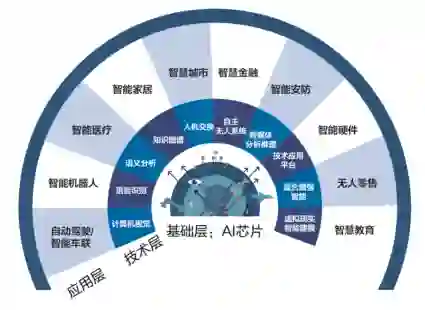 人工智能产业技术架构从内到外依次是基础层、技术层和应用层。