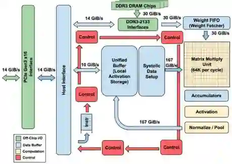 张量处理器TPU是Google于2016年发布的一款专门为Google深度学习框架Tensor Flow设计的ASIC芯片,先后共发布了三代产品,目前最新一代为TPU3.0。TPU的核心是由乘加器组合形成的256×256的运算器阵列,可以执行8位无符号和有符号整数乘法和加法。与CPU、GPU不同,TPU的ALU直接相连并处理传递信息,无需内存,从而大大减少了计算延迟。