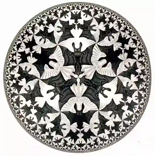 如同《阿尔罕布拉宫的回忆》,埃舍尔的《天使与恶魔》深深地震撼了老顾。对于世界上绝大多数的文化宗教而言,其核心主题都是人性善恶交织,永远缠斗。中国上古的太极图,本质上也是表达类似思想。太极图的阴阳双鱼象征着善恶,具有旋转对称。但是,阴阳双鱼的对称群只有两个元素,远小于埃舍尔的《天使与恶魔》中表现的无穷阶对称群。埃舍尔的《天使与恶魔》在共形意义下统摄了世间万物,因此其精密程度远远高于阴阳双鱼。道教文化满足于哲学层面和美学层面的阐述,“道可道,非常道”,“玄而又玄,众妙之门”。数学的发展就是为了将玄虚的哲学定量成精确的数学。那时,老顾觉得对于曲面几何而言,众妙之门就在于《天使与恶魔》背后的数学定理:单值化。