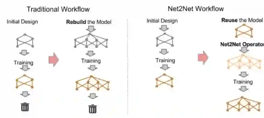 4)基于网络态射结构(network morphism-based structure):一般的网络设计方法是首先设计出一个网络结构,然后训练它并在验证集上查看它的性能表现,如果表现较差,则重新设计一个网络。可以很明显地发现这种设计方法会做很多无用功,因此耗费大量时间。而基于网络态射结构方法能够在原有的网络结构基础上做修改,所以其在很大程度上能保留原网络的优点,而且其特殊的变换方式能够保证新的网络结构还原成原网络,也就是说它的表现至少不会差于原网络。