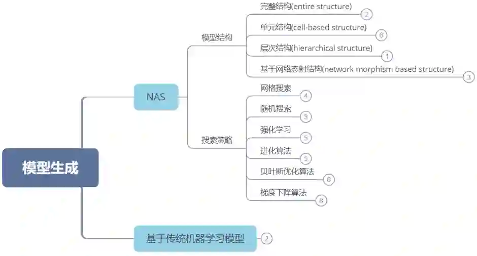 模型生成的方式主要有两种:一是基于传统的机器学习方法生成模型,例如SVM,decision tree等,已经开源的库有Auto-sklearn和TPOT等。另一种是是神经网络结构搜索(NAS)。我们会从两个方面对NAS进行总结,一是NAS的网络结构,二是搜索策略。