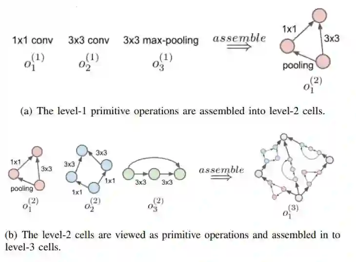 3)层次结构(hierarchical structure):不同于上面将单元结构按照链式的方法进行连接,层次结构是将前一步骤生成的单元结构作为下一步单元结构的基本组成部件,通过迭代的思想得到最终的网络结构。如下图所示,(a)中左边3个是最基本的操作,右边是基于这些基本操作生成的某一个单元结构;(b)中左边展示了上一步骤中生成的若干个单元结构,通过按照某种策略将这些单元结构进行组合得到了更高阶的单元结构。