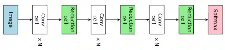 2)基于单元结构(cell-based structure):为解决整体结构网络搜索存在的问题提出了基于单元结构设计的方法。如下图所示,搜索到单元结构后需要叠加若干个单元结构便可得到最终的网络结构。不难发现,搜索空间从整个网络缩减到了更小的单元结构,而且我们可以通过增减单元结构的数量来改变网络结构。但是这种方法同样存在一个很明显的问题,即单元结构的数量和连接方式不确定,现如今的方法大都是依靠人类经验设定。