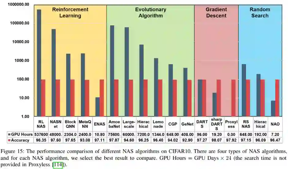 下图总结了不同NAS算法在CIFAR10上的搜索网络所花费的时间以及准确率。可以看到相比于基于强化学习和进化算法的方法,基于梯度下降和随机搜索的方法能够使用更少的时间搜索得到表现优异的网络模型。