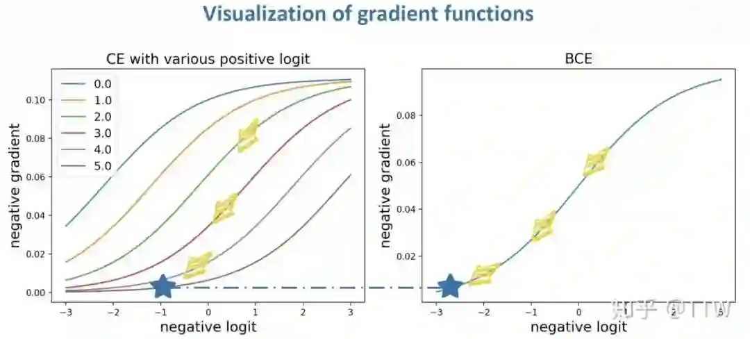 现在我们来考虑分类器对一个负类输出值的求导,两种损失函数对应梯度的差别如上式所示。对于 CE Loss,当同一样本中的正类输出足够高时,对负类输出求导的梯度值也会随之减小,而对 BCE Loss 来说,构造上的独立性导致只有不断降低负类输出值本身才能够降低自身梯度值,从而在训练后期该输出将稳定在一个相对更低的位置上。这个过程的二者的可视化对比如下图所示。(注意这里是损失函数的梯度函数,梯度值的大小影响优化速度)