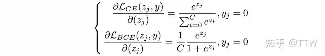 对于第二个问题,我们知道 Cross-Entropy Loss (CE Loss) 是单标签分类中常见的损失函数,其中 softmax 的计算强调分类器需要输出唯一最大预测值,同时正负类别的预测值在损失函数中存在相互影响;而多标签分类则多使用 Binary Cross-Entropy Loss (BCE Loss) ,将任务拆解为一系列相互独立的二分类问题,并以 sigmoid 计算每一类别的输出预测值。