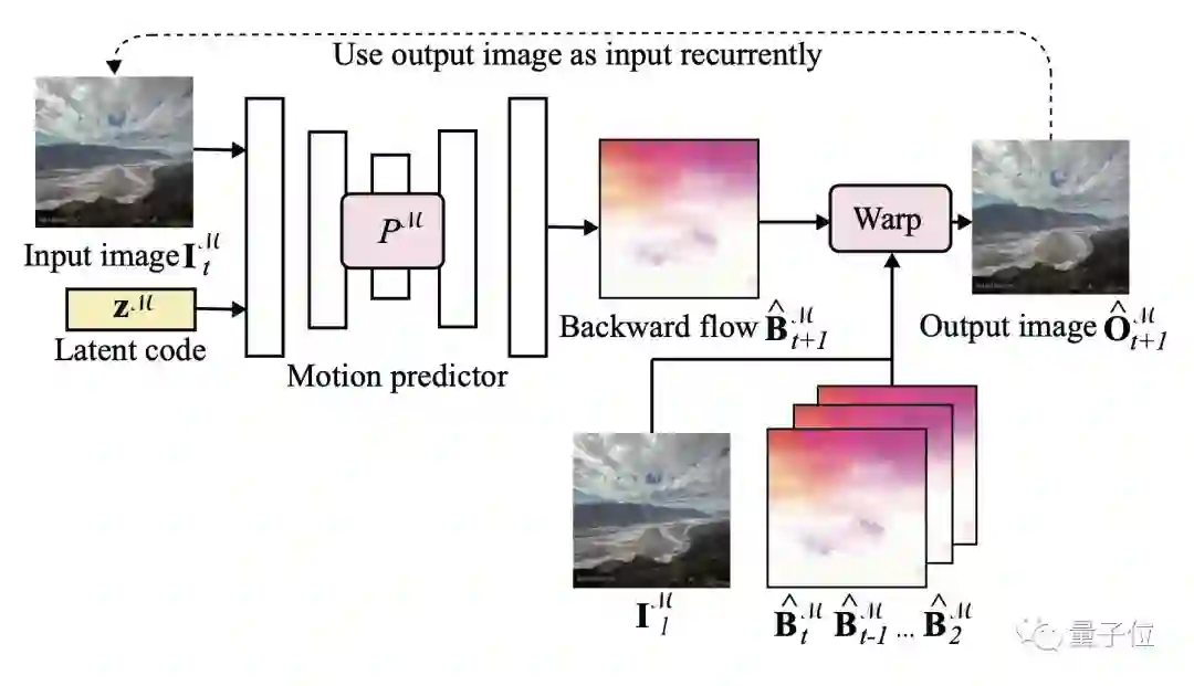 下图展示了视频合成的整个流程:给定输入图像和控制未来变化的潜在代码,运动预测器会生成将来的向后光流(backward flows)。