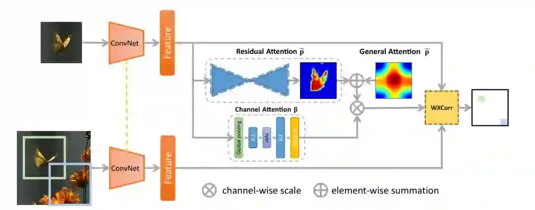 general attention和residual attention结果直接相加得到dual attention。其中general attention描述了所有训练样本的共性,类似一个普通的高斯分布。residual attention描述了训练样本和当前跟踪目标的不同。