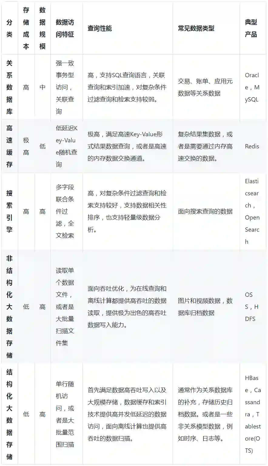 主存储:数据产生自业务或者是计算,通常为数据首先落地的存储。ACID等事务特性可能是强需求,提供在线应用所需的低延迟业务数据查询。