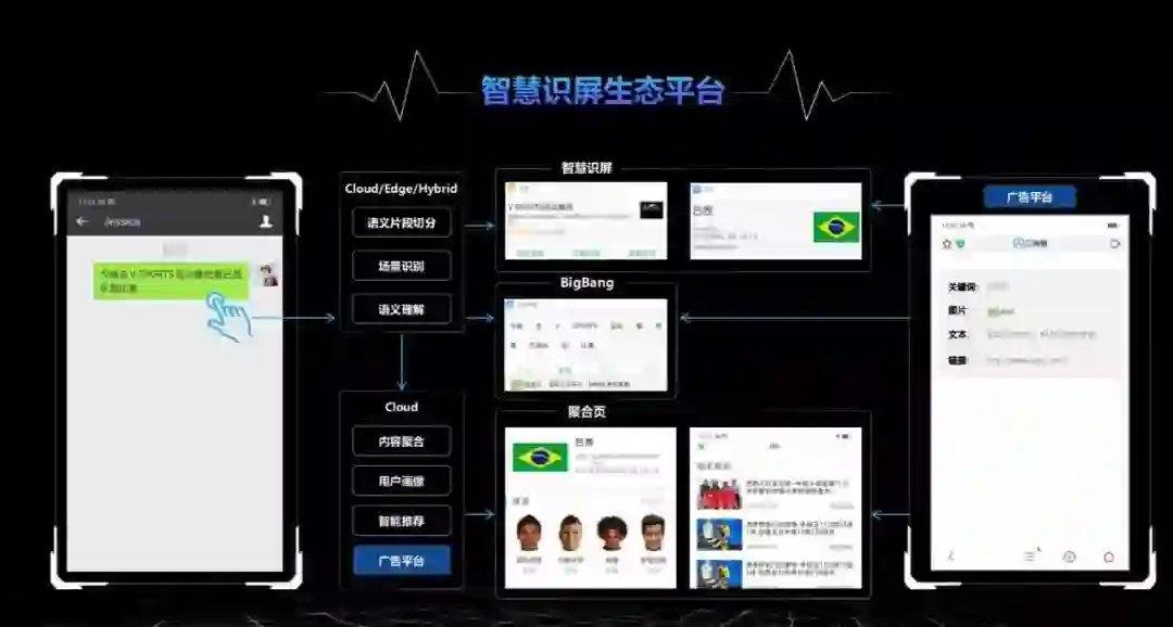 当用户在智能终端开启智慧识屏功能后,只需“一点”——长按手机中任何文本信息,即可触发这个功能,该功能将自动分析用户触碰文本的意图,并识别里面有价值的信息,判断出可以满足用户需求的相关信息,以卡片的形式弹出,用户直接点击卡片就能够一步完成操作。智慧识屏的价值实体已接入上百个不同领域的资源和服务,满足了用户在购物、快递、地图、餐厅、酒店、影视、音乐、动漫、明星等诸多方面的需求。