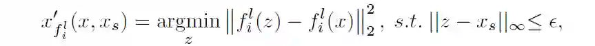 具体而言,对于一张原始图片x_s,我们随机抽取另一张标签为y的图片x,计算x在模型f_i的第l层得到的中间特征。