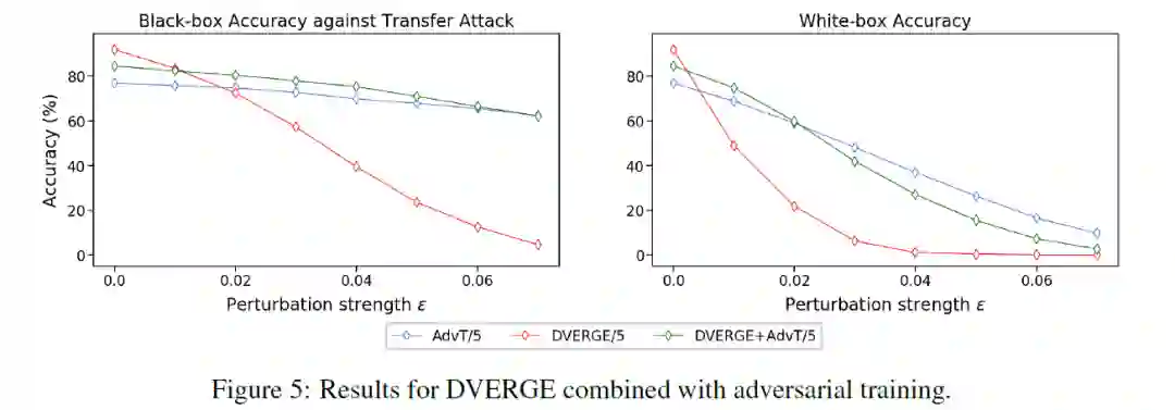 上图展示了DVERGE与对抗性训练相结合的结果,可以看出,结合后的模型体现出了由于对抗性训练模型的准确率,并在黑盒攻击与强度相对较小的白盒攻击下均显示出更高的鲁棒性。