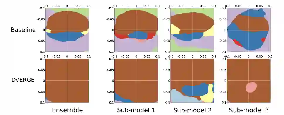 而在第二行中,DVERGE得到的子模型虽然仍有缺陷,但缺陷各不相同,集成在一起就得到了鲁棒的集成模型。