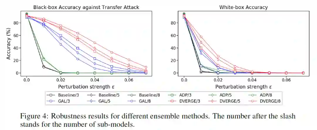 上图左右分别展示了集成模型训练后整体对不同强度的黑盒攻击(在其他模型上生成)与白盒攻击(直接针对集成模型)的鲁棒性。