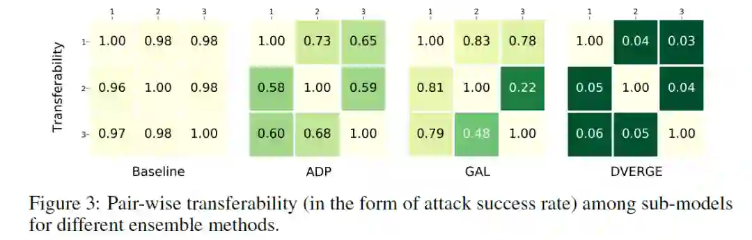 首先展现的是集成模型中各子模型间的对抗攻击迁移成功率。我们在一个子模型上生成对抗攻击,并测试其是否也能误导其他子模型。
