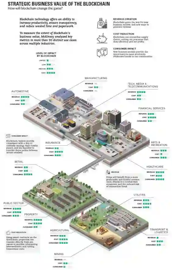 区块链技术提供了提高生产效率,确保透明性,减少时间和案头劳作的能力,来自麦肯锡的研究分析了区块链在不同行业超过90个应用案例中体现的商业价值,并用有限、低、中、高对关键指标进行了评价。总体而言,区块链的价值体现在: