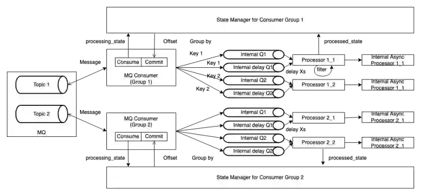整个框架主要由 MQ Consumer, Message Processor 和 State Manager 组成。