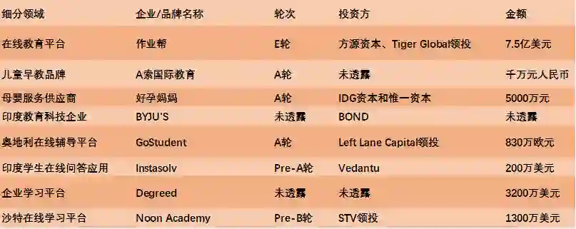资本市场依旧热闹,作业帮完成E轮7.5亿美元融资;儿童早教品牌A索国际教育完成千万级A轮融资。