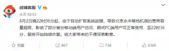 据微博客服消息,8月2日晚22时06分起,由于自动扩容系统故障,导致北京永丰等地机房的宽带容量超限,影响了部分省份移动端用户访问,期间PC端用户可正常使用,至22时36分,服务开始陆续恢复。