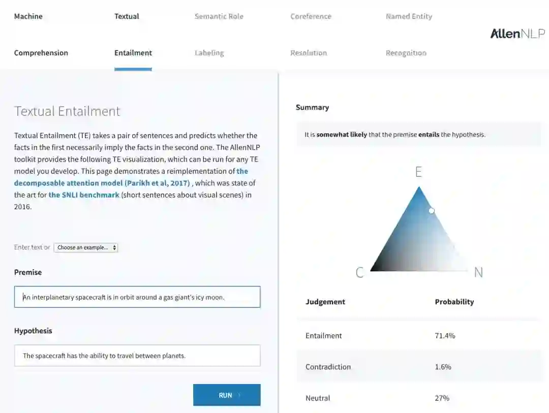 艾伦人工智能研究所发布AllenNLP,包括多个NLP先进模型:标准NLP任务的参考实现和易用web demo。
