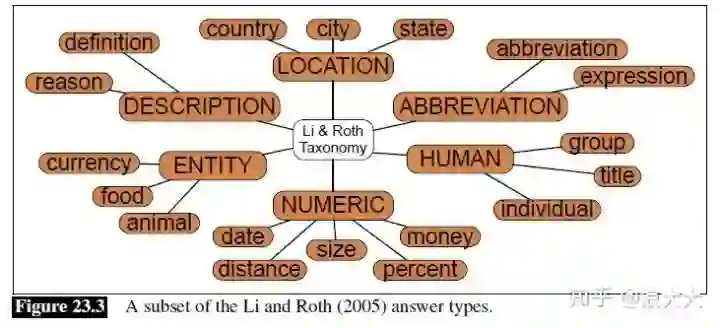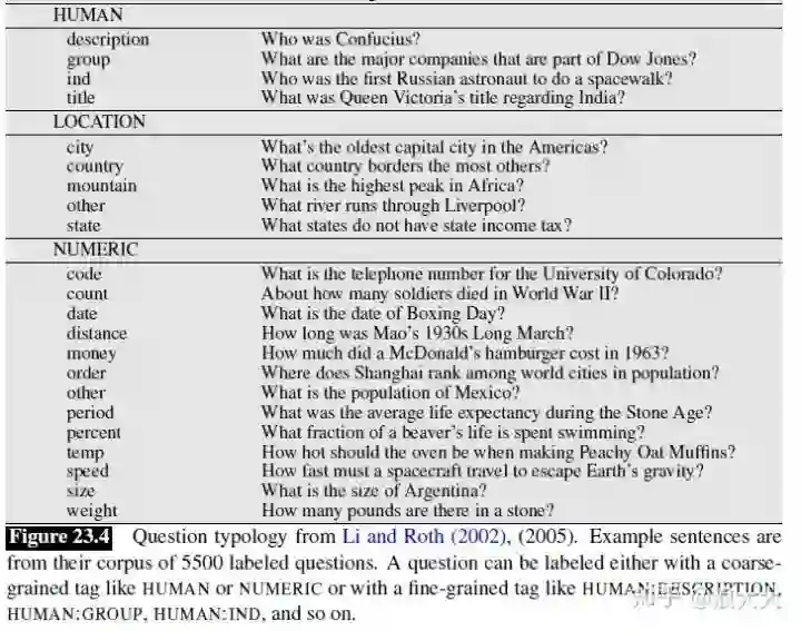虽然回答类型可能只是人名、位置和组织之类的命名实体,但是我们也可以使用一组更大的层次结构的回答类型,称为回答类型分类法。这些分类法可以通过WordNet等资源自动构建,也可以手工设计。图23.4显示了这样一个手工构建的本体,Li和Roth标记集;图23.3还显示了一个子集。在这个分层的标记集中,每个问题都可以使用粗粒度标记(如HUMAN)或细粒度标记(如HUMAN:DESCRIPTION、HUMAN:GROUP、HUMAN:IND)等。描述类型通常被称为传记问题,因为答案需要给出一个人的简短传记,而不仅仅是一个名字。问题分类器可以通过手工编写规则来构建,比如以下来自(Hovy et al., 2002)的规则,用于检测答案类型传记