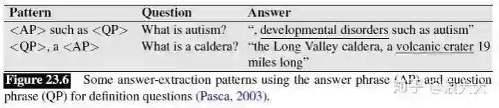有监督学习方法的答案提取训练分类器,以确定一个span或一个句子是否包含一个答案。一个明显有用的特性是上述基线算法的答案类型特征。手写的正则表达式模式也发挥了作用,例如图23.6中定义问题的示例模式