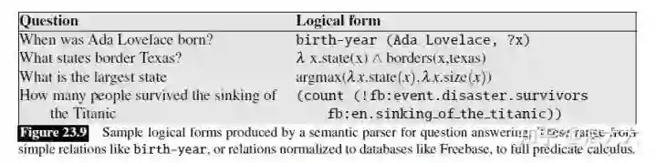 虽然web上大量的文本编码了大量的信息,但信息显然也以更结构化的形式存在。我们使用基于知识的问题回答这个术语,是为了通过将自然语言问题映射到结构化数据库上的查询来回答这个问题。就像基于文本的问题回答范例一样,这种方法可以追溯到自然语言处理的早期,使用棒球等系统回答棒球比赛和统计数据的结构化数据库中的问题。将文本字符串映射到任何逻辑形式的系统称为语义分析器。用于回答问题的语义分析器通常映射到谓词演算的某个版本或查询语言(如SQL或SPARQL),如图23.9中的示例所示。