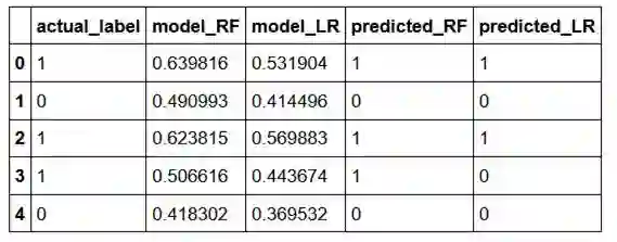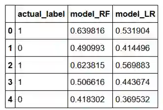 让我们加载一个样本数据集,其中包含两个模型(model_RF 和 model_LR)的真实标签(actual_label)和预测概率。这里的概率是第1类的概率。