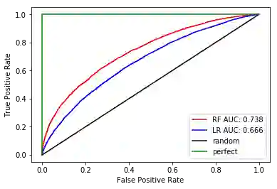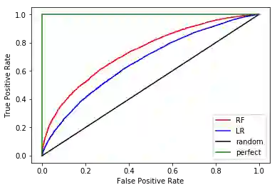 距离黑线较远的ROC更好,因此RF(红色)看起来比LR(蓝色)好