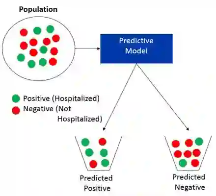 数据科学中预测建模的一个主要领域是分类。分类就是试图预测一个群体中某一特定样本来自哪个类别。例如,如果我们试图预测某个病人是否会再次住院,可能的两类是住院(正)和非住院(负)。然后,分类模型试图预测每个患者是否将住院或未住院。换句话说,分类只是试图简单地预测人群中某一特定样本应该被放在哪个桶中(预测是正的还是预测是负的),如下所示。