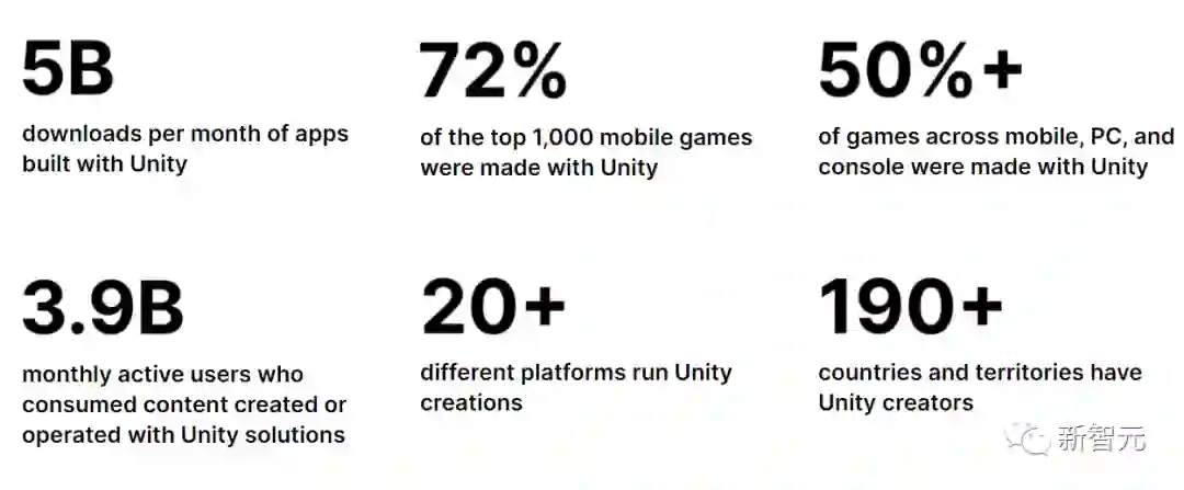 根据Unity官网提供的数据,Unity在全球190多个国家和地区拥有超过39亿活跃用户,在手机游戏市场的份额占比超过70%。