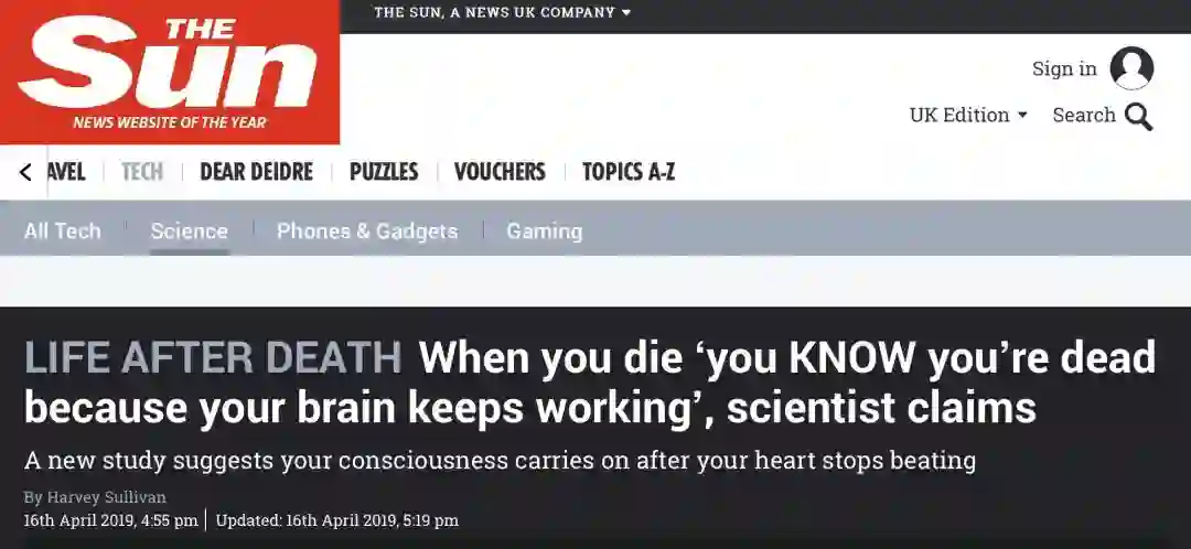 但是,这有一个重要的问题:“心脏骤停时,大脑仍有意识”,并不等同于报道中的“死亡时,大脑仍有意识”。