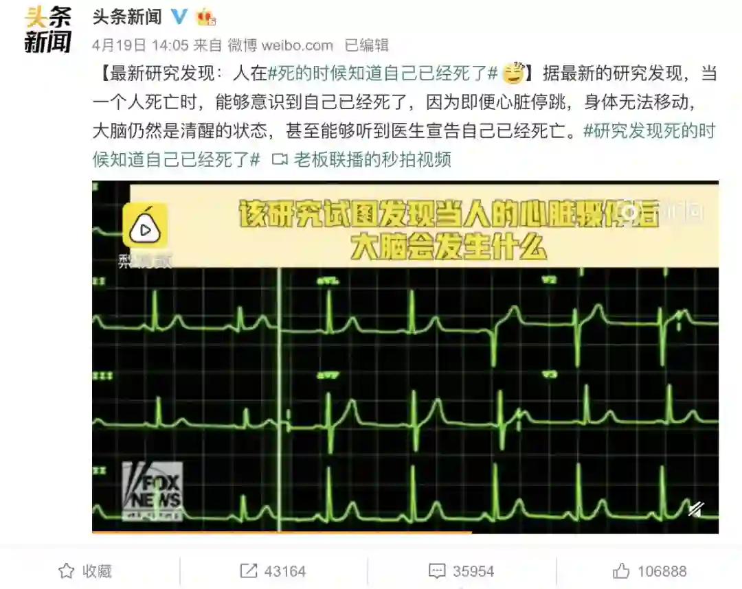 你们看到最近的这个热搜了吗?据说,当一个人死亡时,即使心脏停跳,大脑仍然是清醒的状态,甚至能够听到医生说话;消息称,这个结论来自于一项最新的研究,研究者“试图发现大脑在心脏骤停之后发生了什么”。