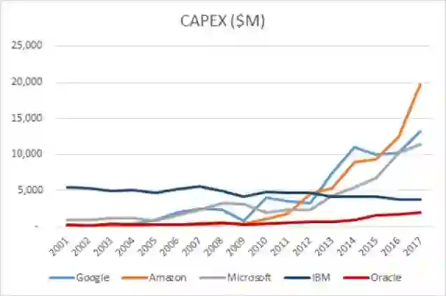 与此同时,前面提到的对云的承诺则主要依赖于对现有业务重新分类后的账务编造;更贴切的数字是该公司的资本支出,2017 年为 32 亿美元,低于 2016 年的 36 亿美元。Charles Fitzgerald 在 Platformonomics 一书中写道: